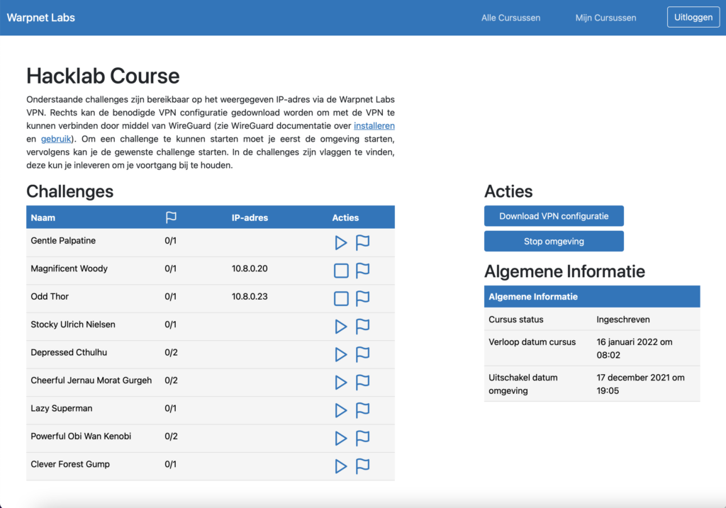To give participants a hands-on experience, it is important that they have access to a controlled environment in which they can practise their new skills. Therefore, we have developed our own Hacklab. The participants get access to the Warpnet Labs portal. Within the portal they can enroll into a course, then they can retrieve an access package for that course containing a VPN connection and start their own personal hacking environment containing over 10 or more hacking challenges that have been built based on real-world experience.
